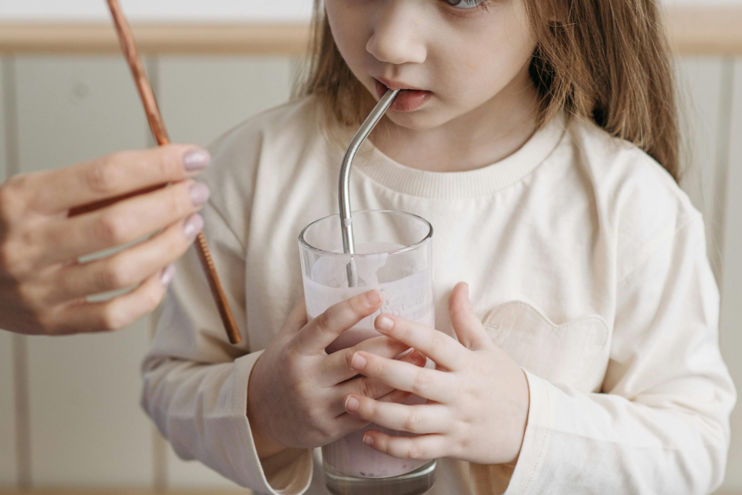 toddler holding a glass of smoothie